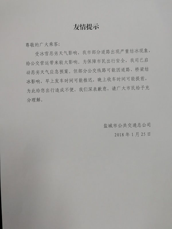 受冰雪惡劣天氣影響,我市部分道路出現(xiàn)嚴重結(jié)冰現(xiàn)象,給公交營運帶來較大影響。為保障市民出行安全,我司已啟動惡劣天氣應(yīng)急預(yù)案。但部分公交線路可能因道路、橋梁結(jié)冰影響,早上發(fā)車時間可能推遲,晚上收車時間可能提前,為此給您出行造成不便,我們深表歉意,請廣大市民給予充分理解。