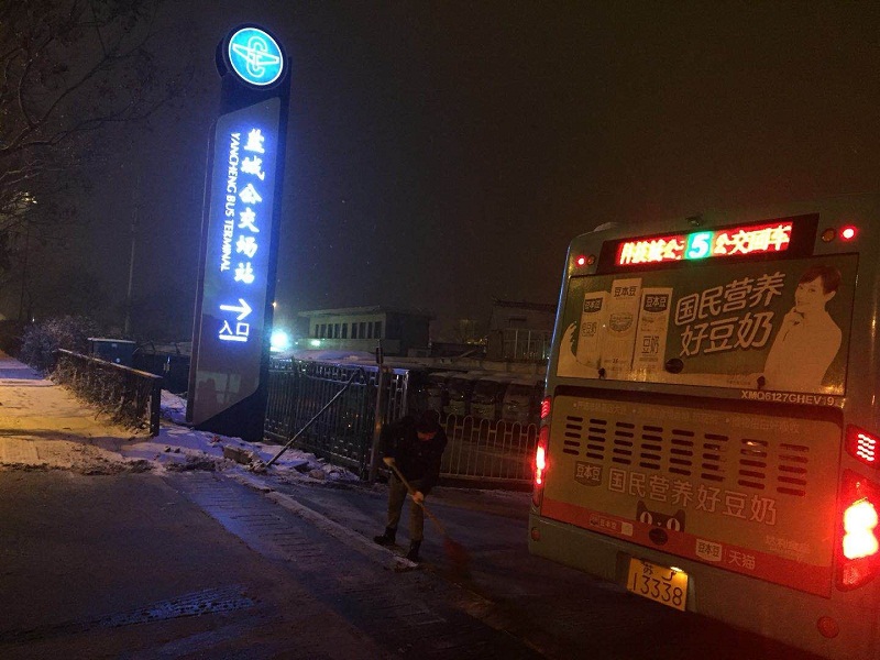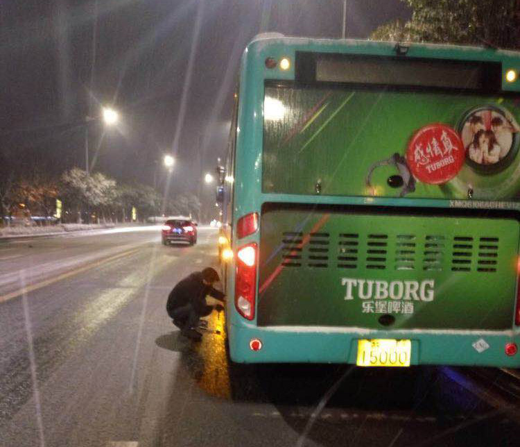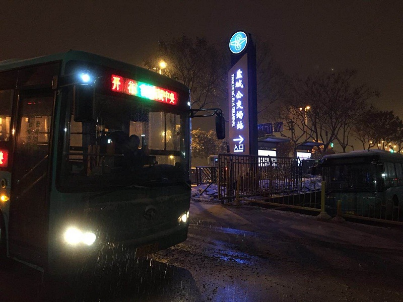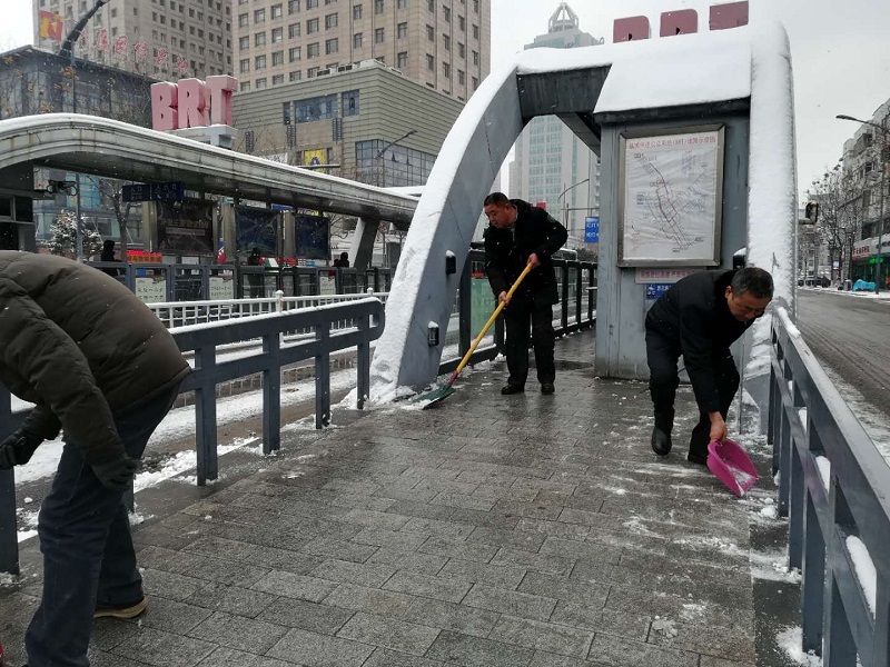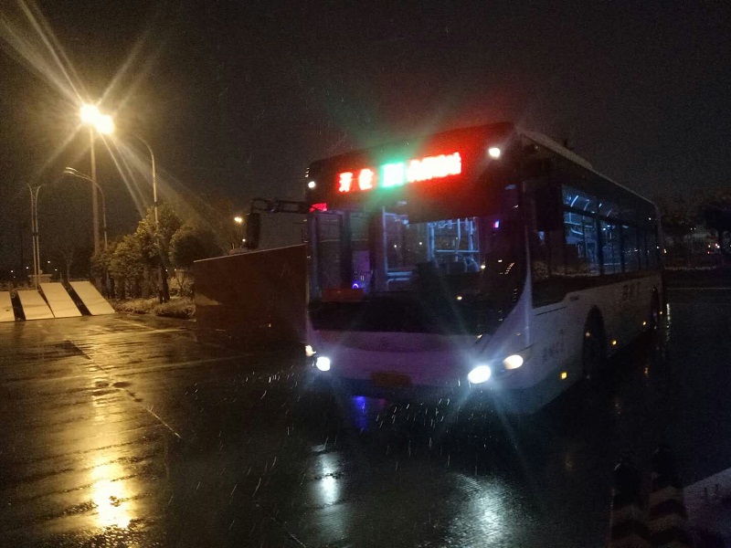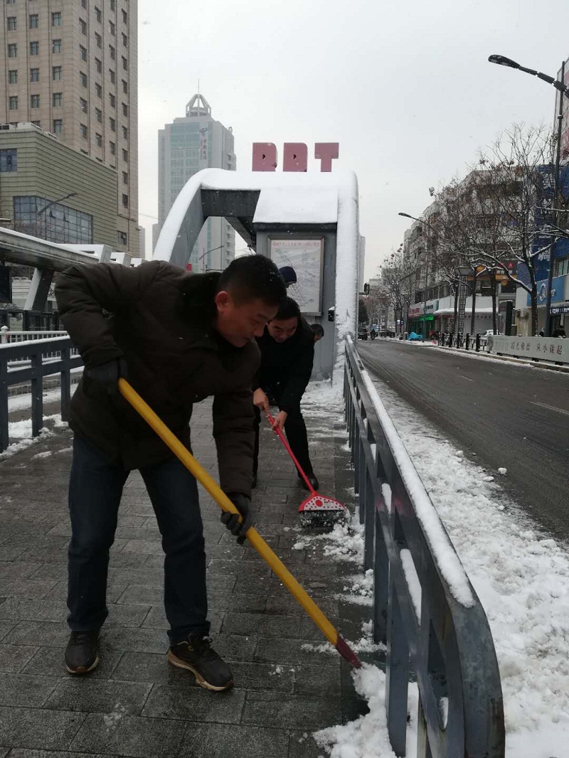 27日24時左右,雪仍在下,所有的公交車輛才基本收班結束,路面濕滑,平均每條線路收班時間比平時延長了1個小時。在此之前,工作人員將所有場站進出口提前掃除干凈。 我們在這里------