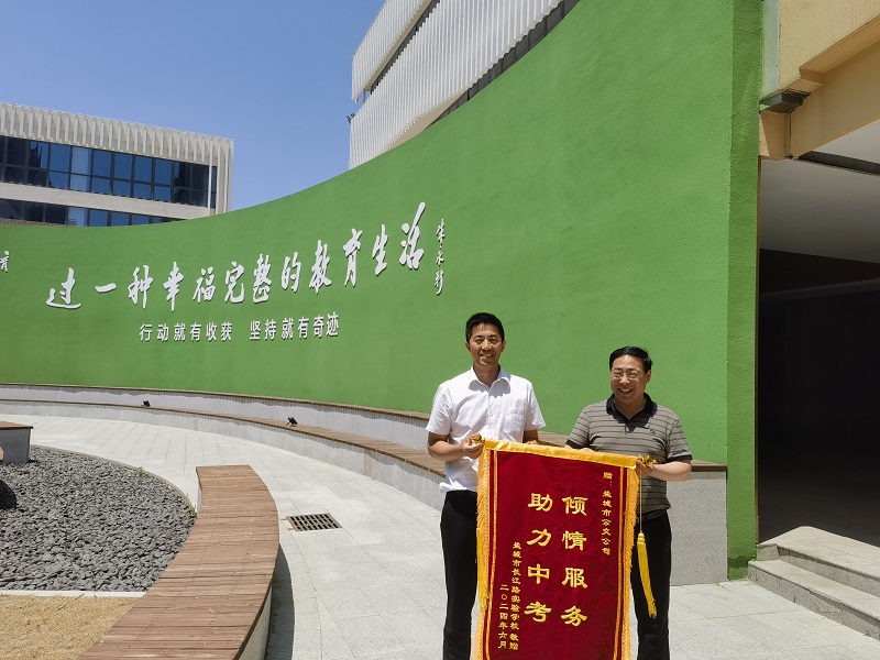 6月18日,隨著中考最后一學(xué)科考試結(jié)束,屬于四分公司的2024年中考“大考”也落下帷幕。在中考期間,四分公司為南京師范大學(xué)鹽城實(shí)驗(yàn)學(xué)校、鹽城市長(zhǎng)江路實(shí)驗(yàn)學(xué)校等4所中學(xué)提供的貼心送考服務(wù),6月15日至18日,共接送考生4000余人次,受到了廣大師生及家長(zhǎng)的廣泛好評(píng)。為表達(dá)感謝,長(zhǎng)江路實(shí)驗(yàn)學(xué)校孫校長(zhǎng)特意送上了一面印有“傾情服務(wù)、助力中考”的錦旗。
