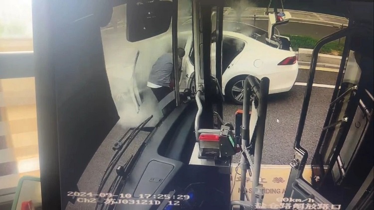 一小轎車(chē)馬路上突發(fā)起火 公交司機(jī)拎起滅火器就往上沖