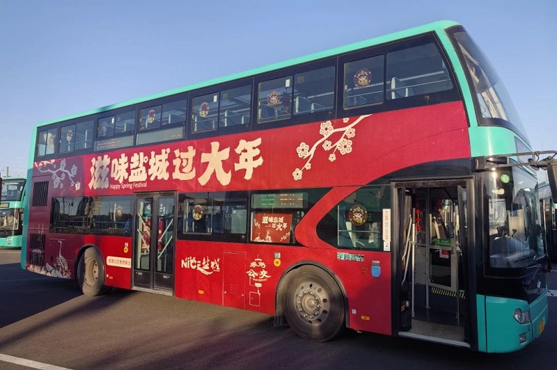 公交旅游專線為雙層巴士,車身裝飾以紅色色調(diào)為主,噴繪了“滋味鹽城過大年”的字樣,所到之處,便是一道靚麗的風景線。車廂內(nèi)巳蛇賀歲的主題貼紙,可愛的卡通蛇形象栩栩如生,似在向乘客們俏皮問好;新年快樂與福字拉花錯落有致地懸掛在車廂頂部,隨著車輛行駛輕輕晃動,洋溢著濃郁的節(jié)日氛圍;一張張寓意美好的窗花裝點著車窗,傳遞著公交人對乘客的美好祝愿……萌趣的祥蛇元素隨處可見,將喜慶溫馨的節(jié)日氣氛感直接拉滿。