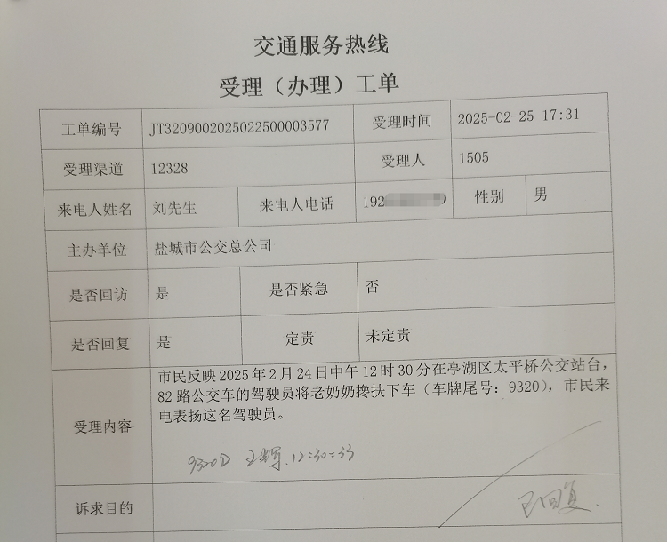 225日,二分公司收到了一則來自12328交通服務(wù)熱線的表揚工單,對尾號為932082路公交車駕駛員熱心攙扶老奶奶下車的行為給予了高度贊揚。