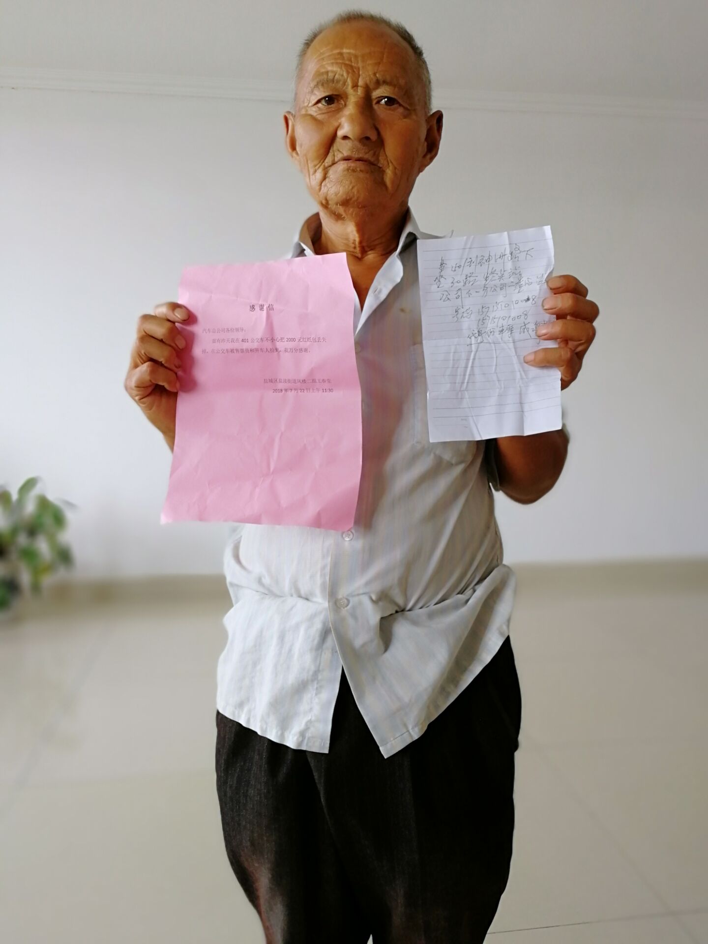 這位“客人”叫王春堂,是位古稀老人,22日中午在乘坐K401(蘇J12578)時(shí),不小心將身上的現(xiàn)金遺落在車上。該趟公交駕乘人員周其高、陳曉燕撿到后,積極聯(lián)系公司幫助尋找失主,很快將失物歸還給了老人。感動(dòng)之余,王春堂老人寫(xiě)下感謝信,找到了鹽城公交總公司,表達(dá)濃濃的感激之意。