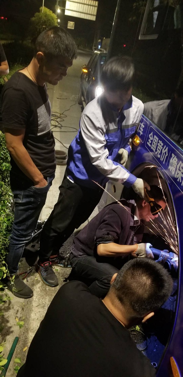 由于現(xiàn)場(chǎng)沒(méi)有電源,電動(dòng)切割機(jī)無(wú)法作業(yè),修理公司經(jīng)理朱建軍經(jīng)多方聯(lián)系,終于在總公司行政處的幫助下借到一臺(tái)柴油發(fā)電機(jī),并順利完成了現(xiàn)場(chǎng)切割打磨作業(yè)和維修作業(yè),將車(chē)輛拖回修理公司進(jìn)行場(chǎng)地修復(fù)作業(yè)。