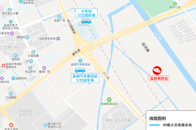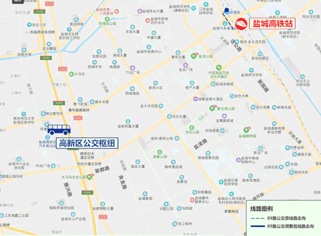 線路走向:高新區(qū)公交樞紐、振興路、鹽瀆路、新204國道、新都路、良友路、鹽瀆路、新園路、世紀大道、范公路、鹽城高鐵站