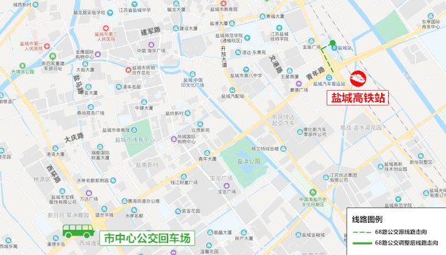 線路走向:西環(huán)路、東進路、解放路、青年路、鹽城高鐵站