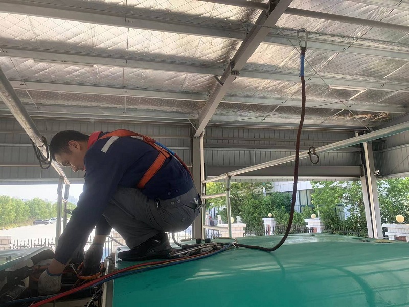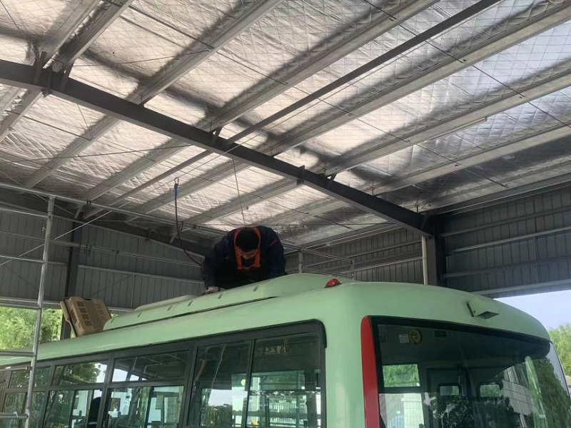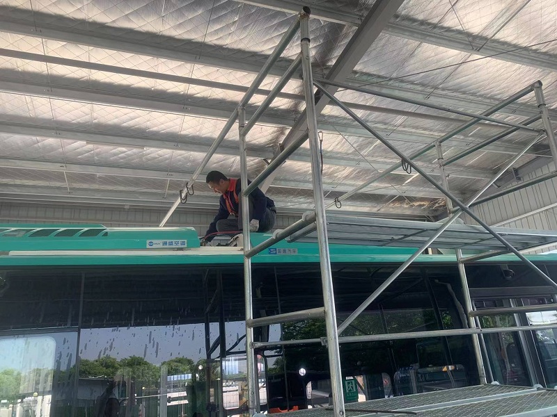 為了保證夏季公交車輛空調(diào)的正常使用,近期,公交修理分公司組織人員對所有車輛的空調(diào)系統(tǒng)進行專項排查檢修。由于公交車輛空調(diào)大部分都在車輛的頂部,給維修工作帶來很大困難。維修人員需要做好充分安全防護,才能有效對車輛空調(diào)進行檢修。在修理分公司空調(diào)專項維保場地上,修理人員必須佩戴好高空作業(yè)專用安全繩,登上安全作業(yè)架,在充分保障維修人員安全的情況下進行空調(diào)維保工作。