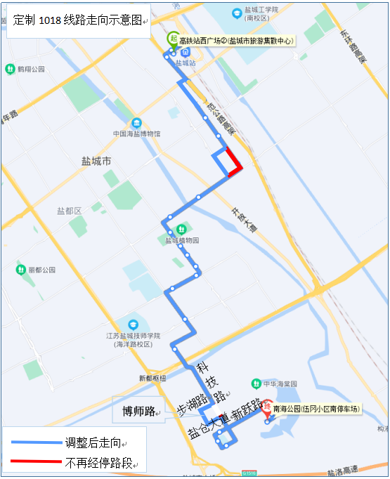 線路站點:海棠樂園(伍岡花園)、科技園學(xué)校南門(柏潤花園北門)、科技園學(xué)校西門、新躍路博師路口、博師路鹽倉大道、大數(shù)據(jù)產(chǎn)業(yè)園、學(xué)海路解放路口、藍(lán)海路BRT、中南世紀(jì)城、海洋路勝利路口、新龍廣場、鹽瀆實驗學(xué)校、人民路海闊路口、鹽塘河公園、鹽瀆路人民路口、恒大帝景、鹽瀆路文港路口(單)、文港路鹽瀆路口(單)、文港路聚亨路口(單)、新園路聚亨路口、新園路新都路口、新河家園、范公路世紀(jì)大道、范公路東進(jìn)路口、高鐵站西廣場北(鹽城市旅游集散中心)、高鐵站西廣場(鹽城市旅游集散中心)。