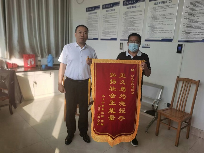 2022年7月19日,公交二分公司接到市民王女士送來(lái)的兩面錦旗,感謝夜5線公交車駕駛員吳國(guó)輝和東環(huán)路車場(chǎng)管理員劉其成,表?yè)P(yáng)他們“見(jiàn)義勇為施援手,弘揚(yáng)社會(huì)正能量”。