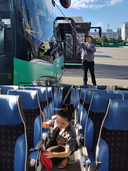 炎炎夏日,他們不懼烈日,在做好車(chē)輛衛(wèi)生工作的同時(shí),對(duì)抹布、刷子等隨車(chē)物品也統(tǒng)一擺放在指定位置,為乘客提供良好的乘車(chē)環(huán)境。