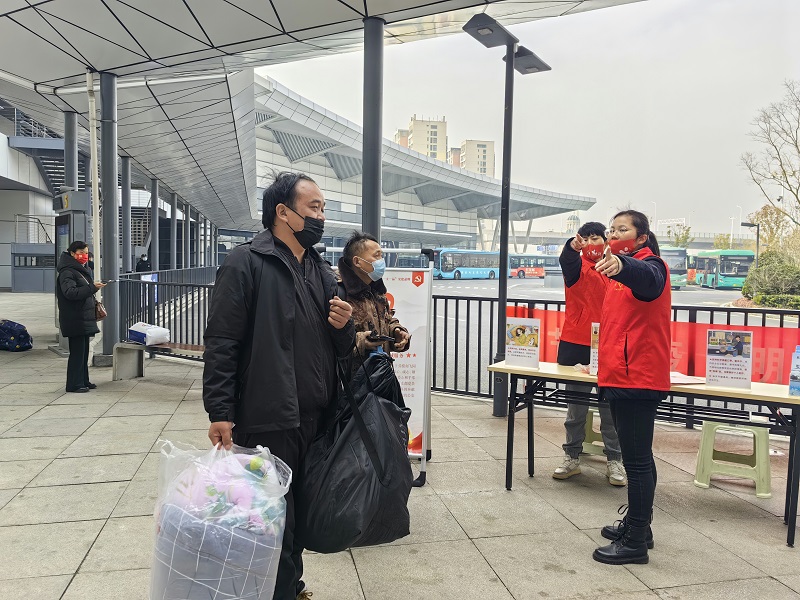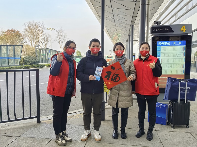 此外,志愿者們還為過往旅客送上了一只只印有“大吉大利”祝福語的紅口罩、一張張喜慶的新年“!弊郑屄每桶研履甑牡谝环葑8Щ丶,營造歡樂祥和的節(jié)日氛圍。