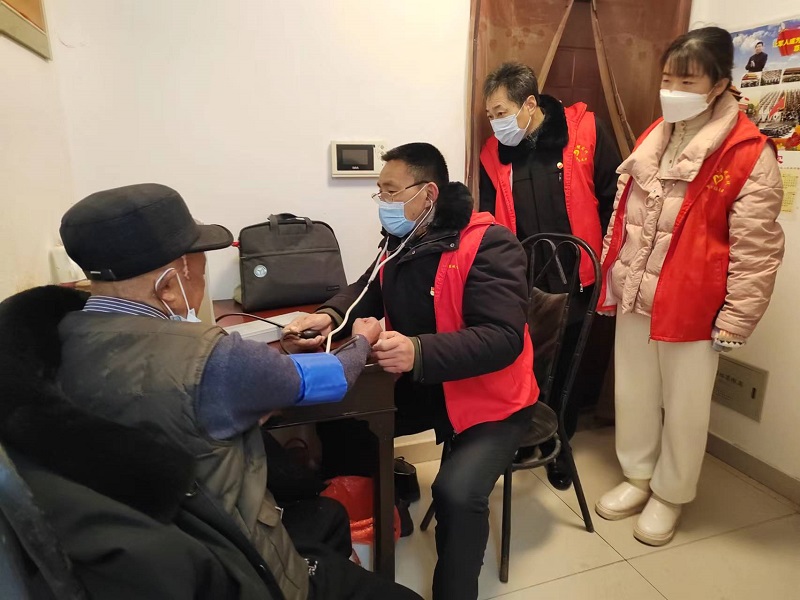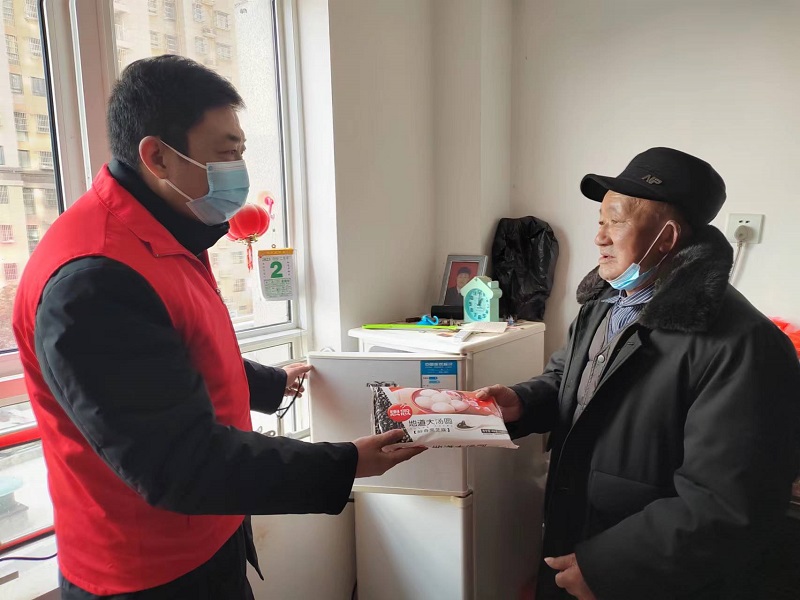情暖“一老”,關懷到家。在空巢老人家中,志愿者們親切地與老人談心交流,在家長里短的交流中細心詢問老人的身體情況及生活狀況,為老人送上了糧、油和湯圓等慰問品。在得知老人患有高血壓后,志愿者劉飛為老人測量了血壓,叮囑老人要按時服藥、合理調節(jié)飲食起居。