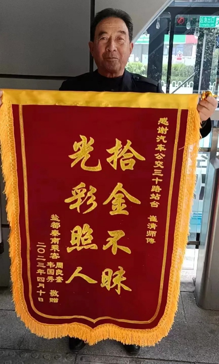 4月15日上午,周老先生特意攜帶一面印著“拾金不昧,光彩照人”的錦旗來到30路公交車終點(diǎn)站,表達(dá)了對崔清師傅和公交公司的感激之情。