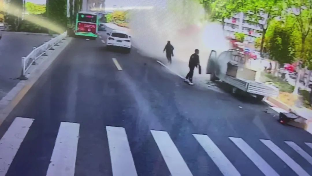 監(jiān)控顯示,5月9日上午11時(shí)36分左右,31路線駕駛員金浦駕駛蘇J09797D行駛到西環(huán)路鶴翔路口附近時(shí),發(fā)現(xiàn)一輛行駛中的小貨車車后廂的貨物燃起熊熊大火。發(fā)現(xiàn)著火后,車主立即停車設(shè)法撲救。