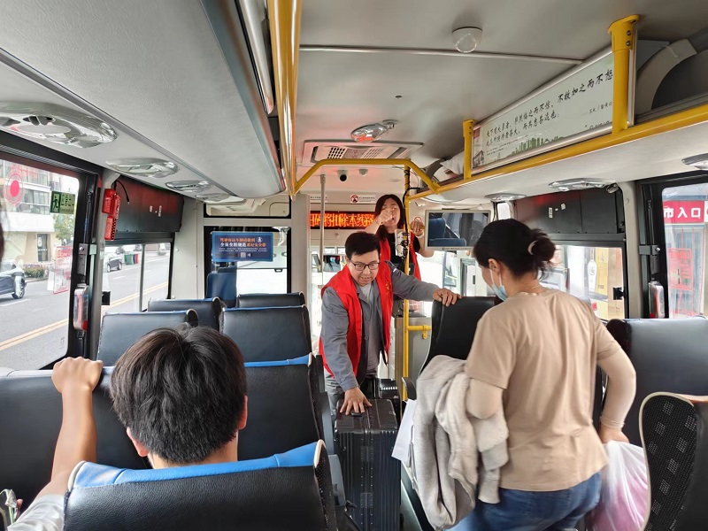 公交站乘車現(xiàn)場(chǎng)熱鬧而有序,5名志愿者幫助學(xué)生搬運(yùn)行李箱、提醒他們佩戴口罩、為他們提供導(dǎo)乘服務(wù)。僅僅10多分鐘,需要乘車的學(xué)生和家長(zhǎng)們都有序上了車。車廂內(nèi),工作人員向大家宣傳綠色出行理念,并表示分公司將根據(jù)學(xué)校放假時(shí)間,采取加密車次、增加運(yùn)力、志愿者服務(wù)等舉措,應(yīng)對(duì)可能“井噴”的學(xué)生客流,將學(xué)生們安全、準(zhǔn)點(diǎn)地送回家,希望家長(zhǎng)們能夠放心將孩子交給“公交人”。同時(shí),志愿者們向?qū)W生開展了普法宣傳,引導(dǎo)青少年樹立法治觀念。這一舉動(dòng)得到家長(zhǎng)們紛紛點(diǎn)贊。
