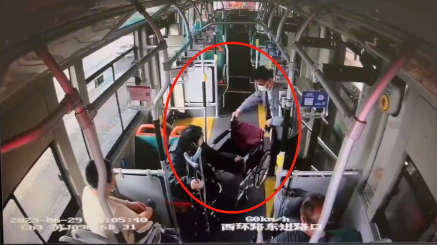 看到一位乘坐輪椅出行的殘疾女士要上車,公交司機(jī)立即打開駕駛室的門,將女士扶上車并找好座位后,又將其輪椅抬上車,女士下車時(shí),司機(jī)又主動(dòng)將其和輪椅送下車。蔡鳳明的暖心之舉贏得乘客紛紛點(diǎn)贊。