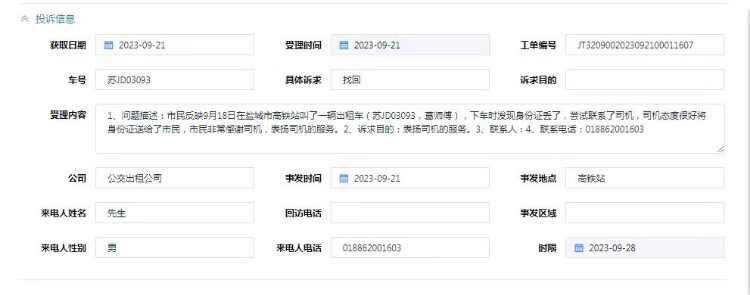 9月21日,公交出租汽車公司接到12328轉(zhuǎn)來的表揚工單,表揚蘇JD03093號出租車駕駛員葛師傅撿到身份證主動聯(lián)系歸還,真是熱心腸好司機。